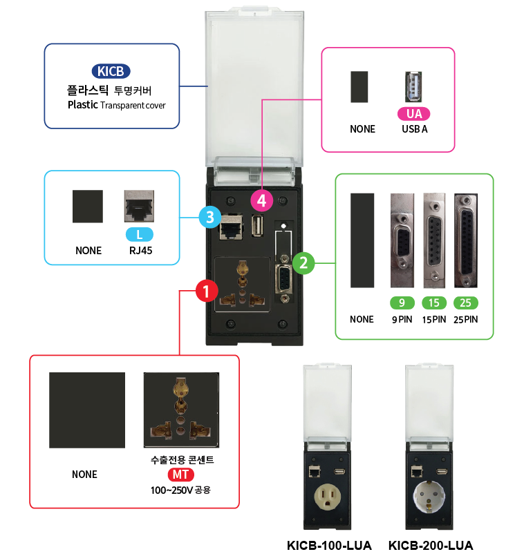 D-SUB(RS-232), AC 콘센트(110V, 220V), 8핀 LAN(RJ-45), USB(A, B, C type) 등 원하시는 사양을 다양하게 조합할 수 있어 경제적입니다.